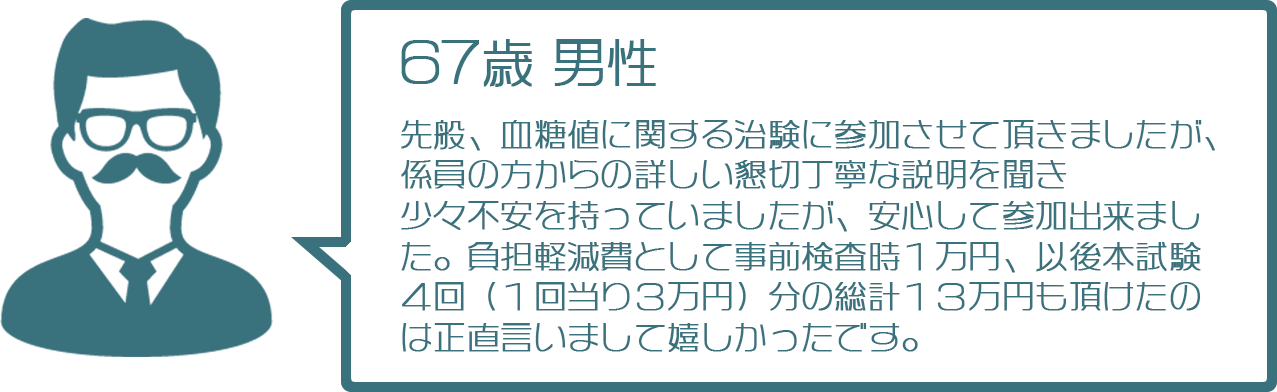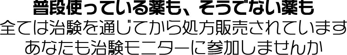 未だに人体実験のイメージが根強い治験ですが、国が主導でとても厳しい基準のもとに行っています。参加される方の人権と安全を何よりも大切に行いますので、強制的に参加しなければならない等は一切ありません。